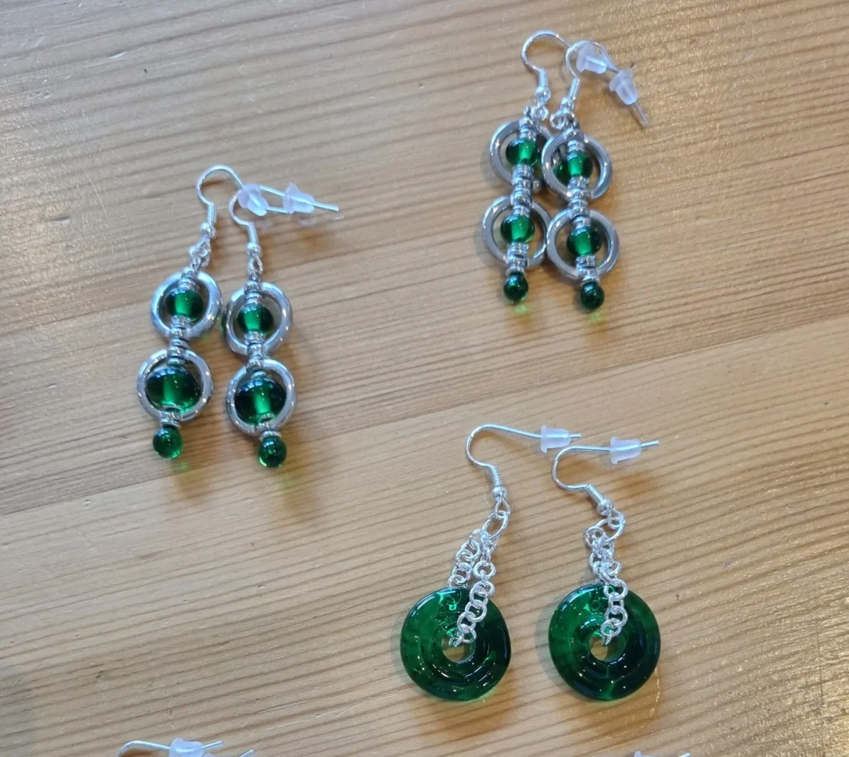 Op verzoek een hele serie groene oorbellen gemaakt met silver plated onderdelen....